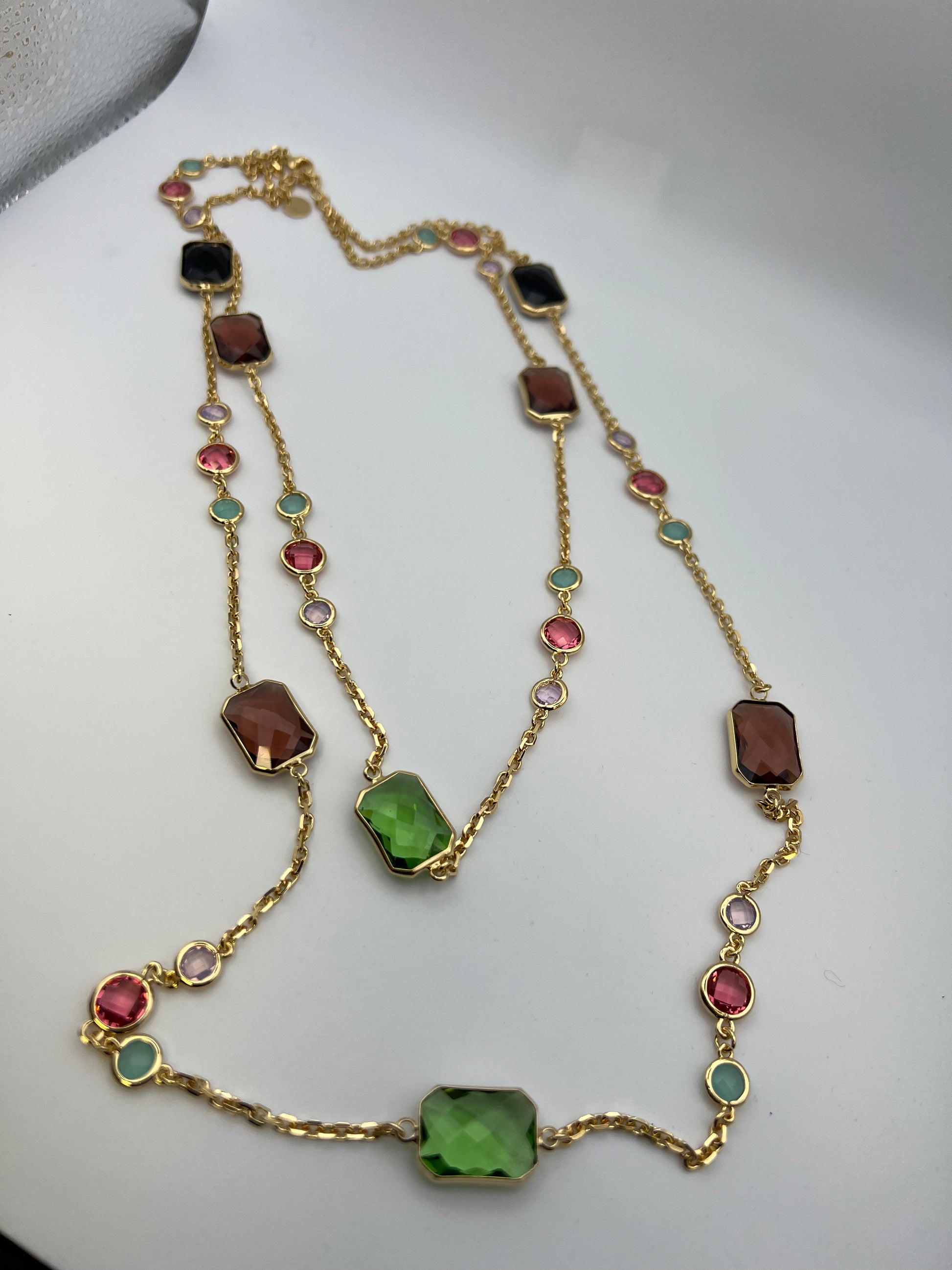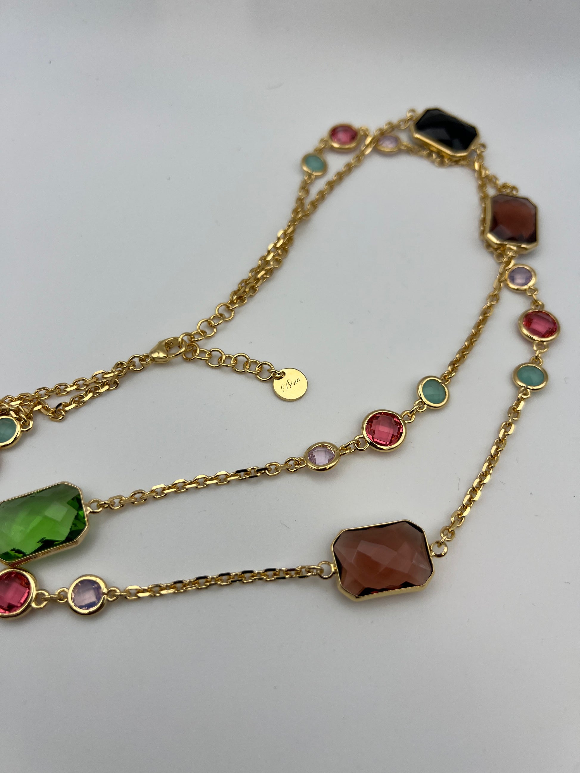 Elegante collana doppia in ottone con finitura color oro, impreziosita da vivaci pietre colorate che catturano la luce ad ogni movimento.